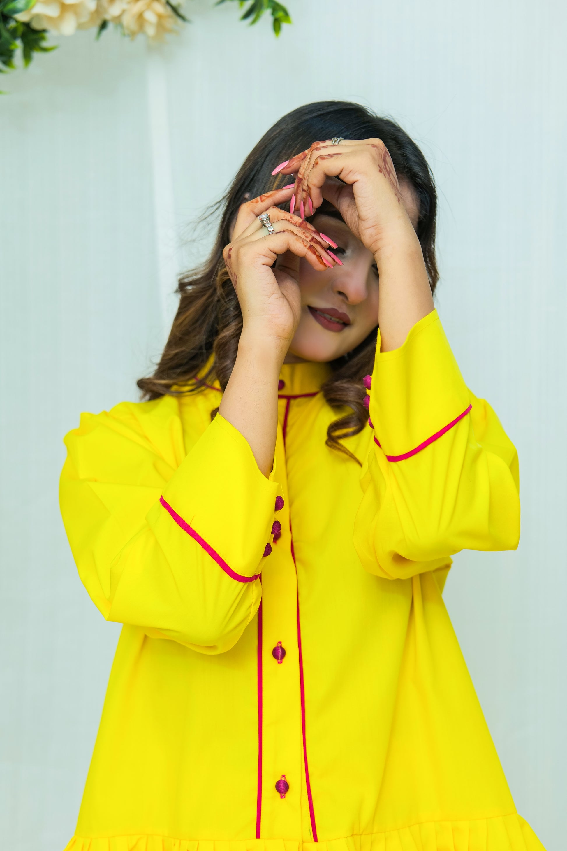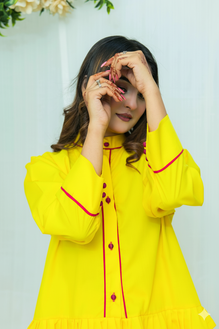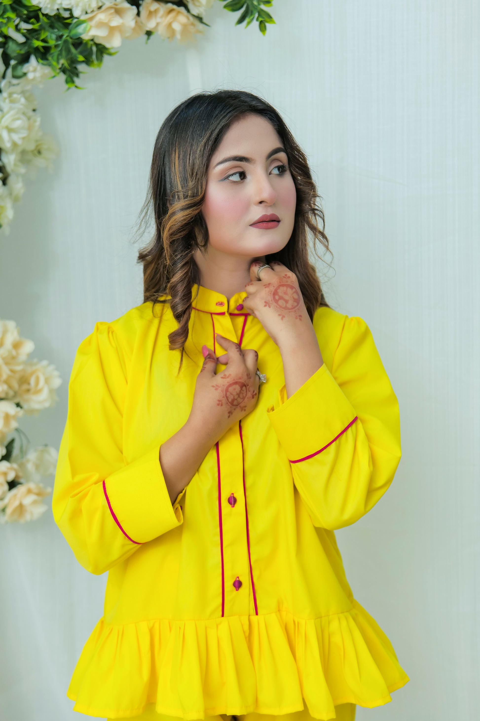 Bright, playful, and full of personality — the Sunbeam 2-Piece Set is made to uplift your wardrobe with a burst of sunshine. Designed in a vibrant yellow hue, this modern Eastern ensemble features charming puff sleeves, a ruffle peplum hem, and contrast piping for a touch of bold detail.