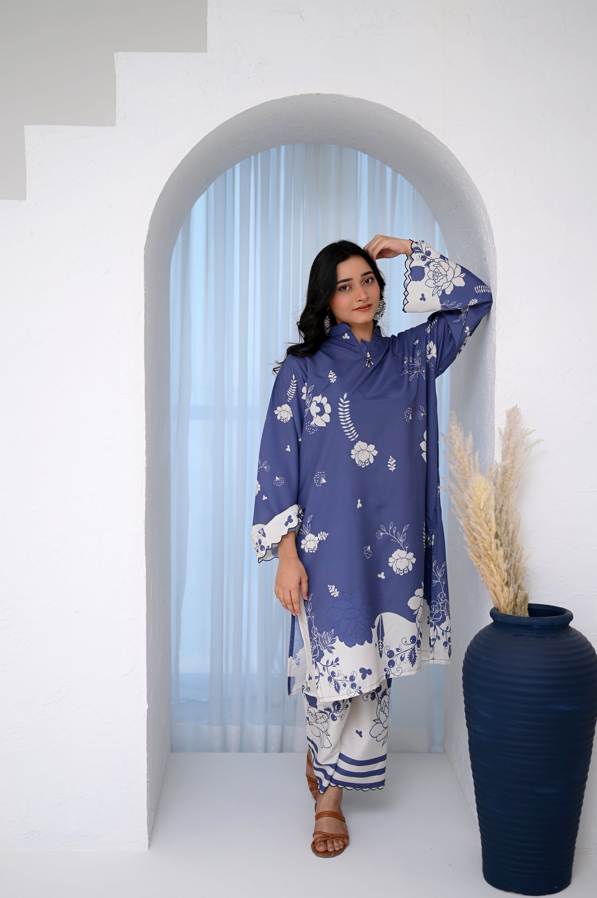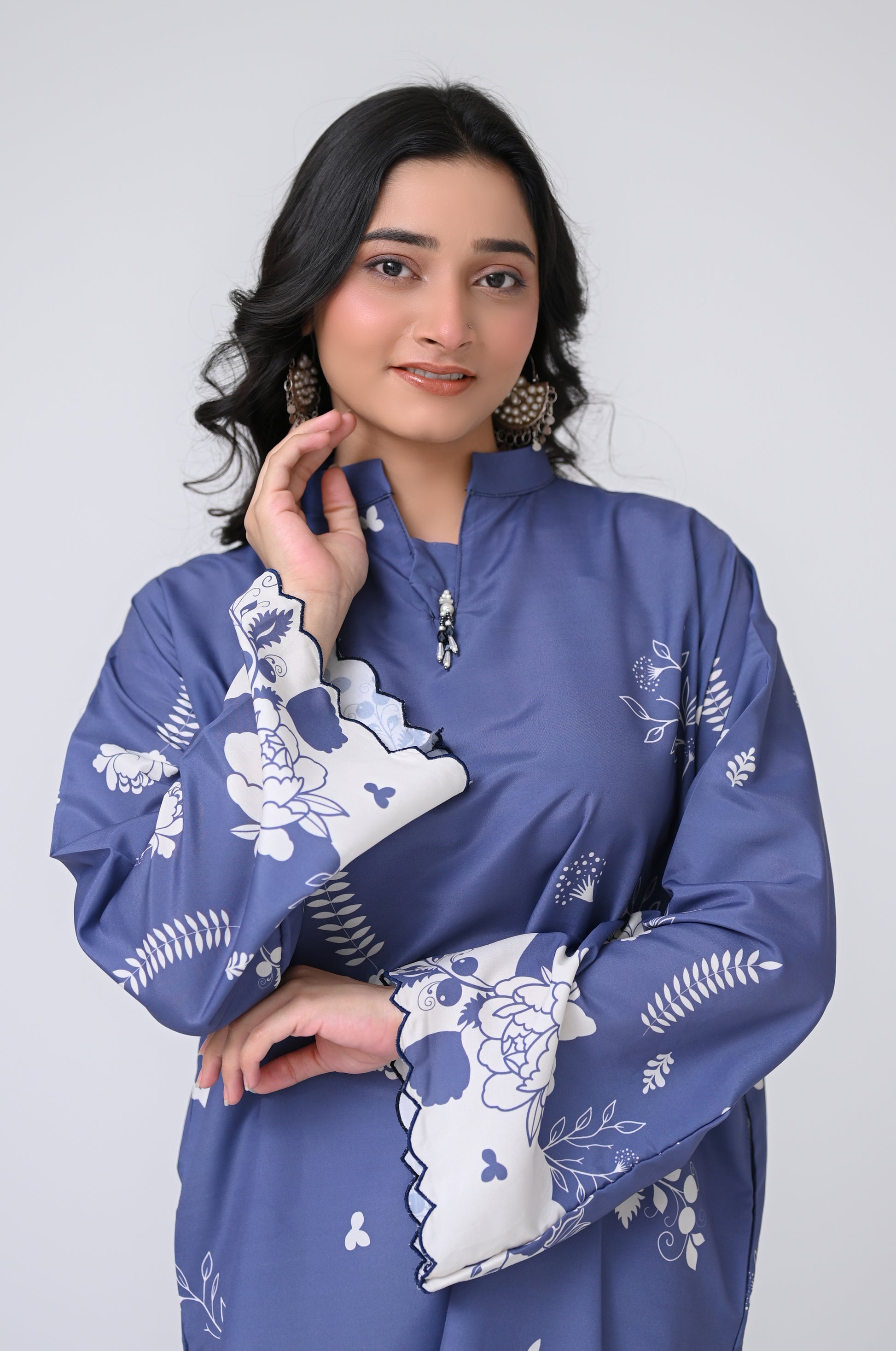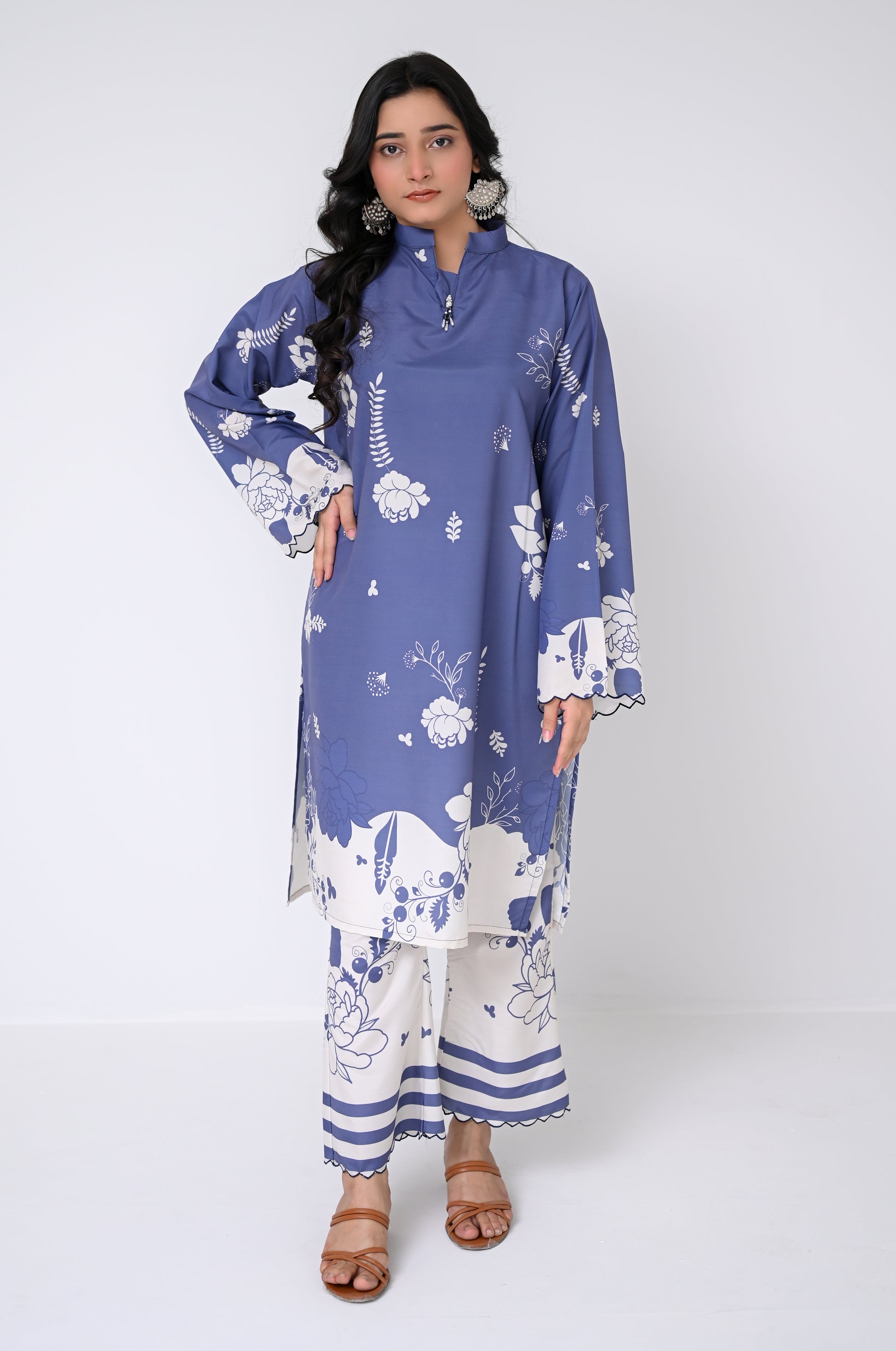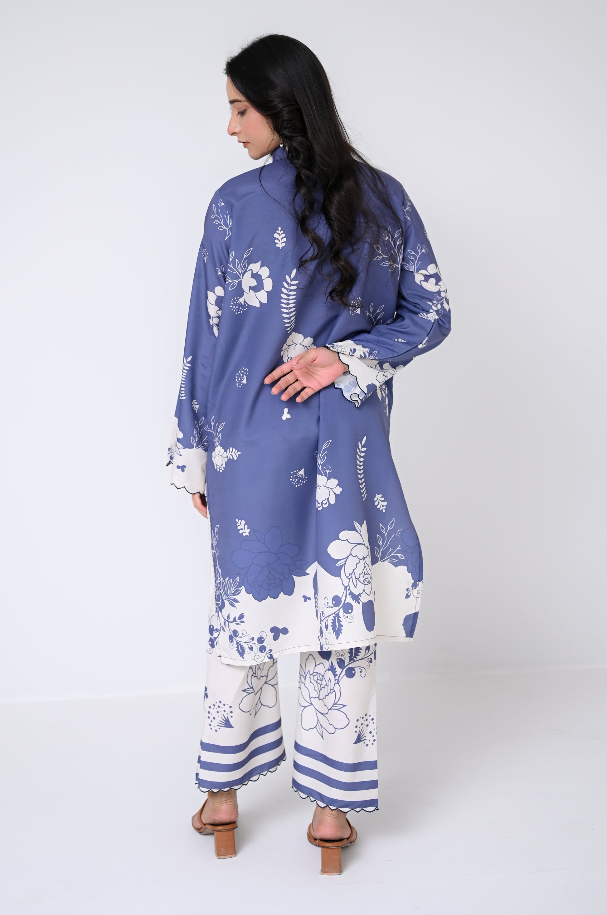 Blue Meadow is a chic 2-piece coord set adorned with delicate embellishments and fine markan work. Soft blue floral detailing and a coordinated trouser give this outfit a refined, elegant look perfect for everyday and semi-formal wear.
