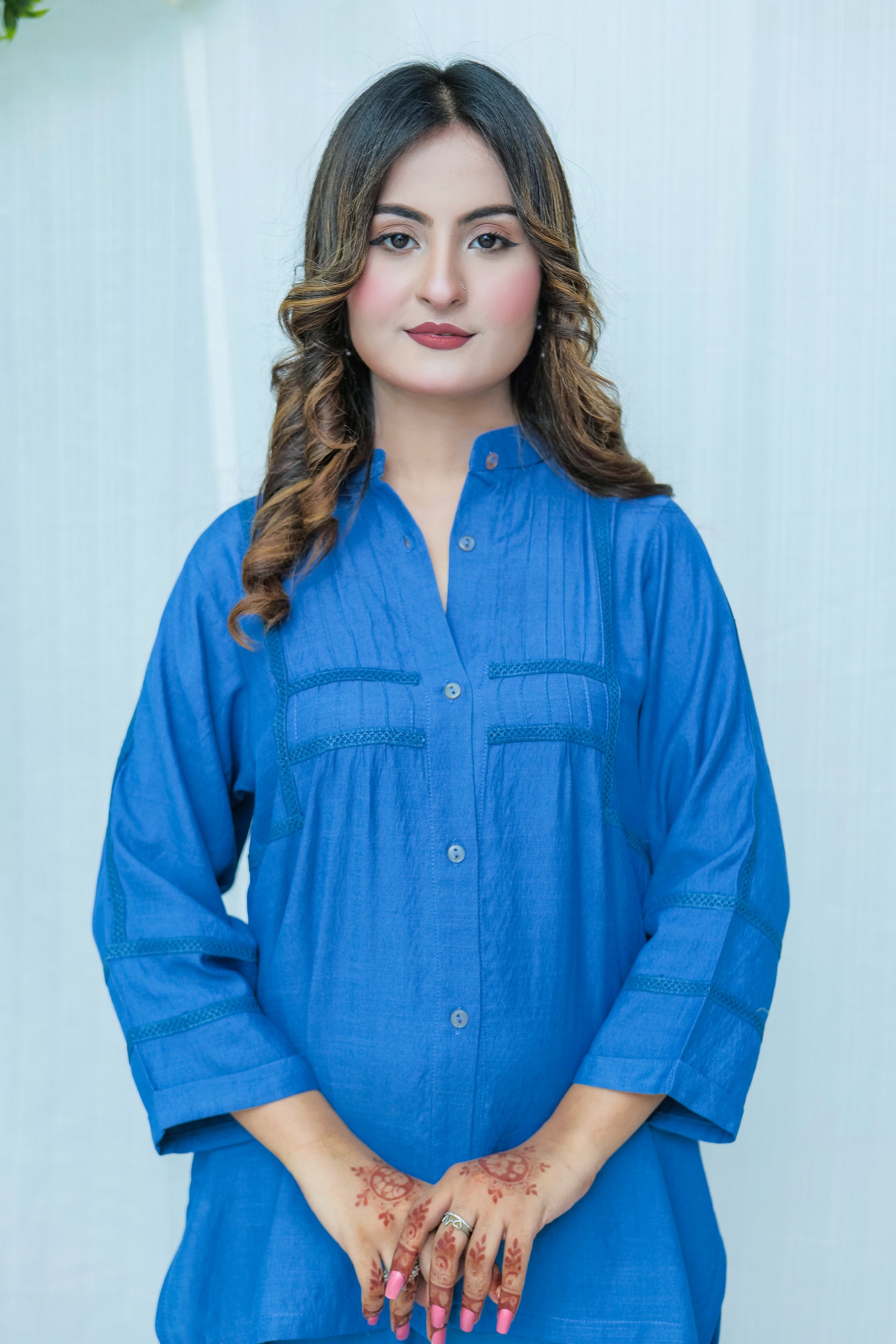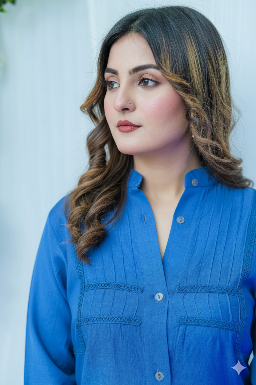Bold, polished, and effortlessly refined — the Azul 2-Piece Set brings a fresh twist to everyday Eastern wear. Designed in a striking blue hue, this outfit features elegant front pintex pleats, delicate matching lace inserts, and soft fabric buttons that add a graceful touch.