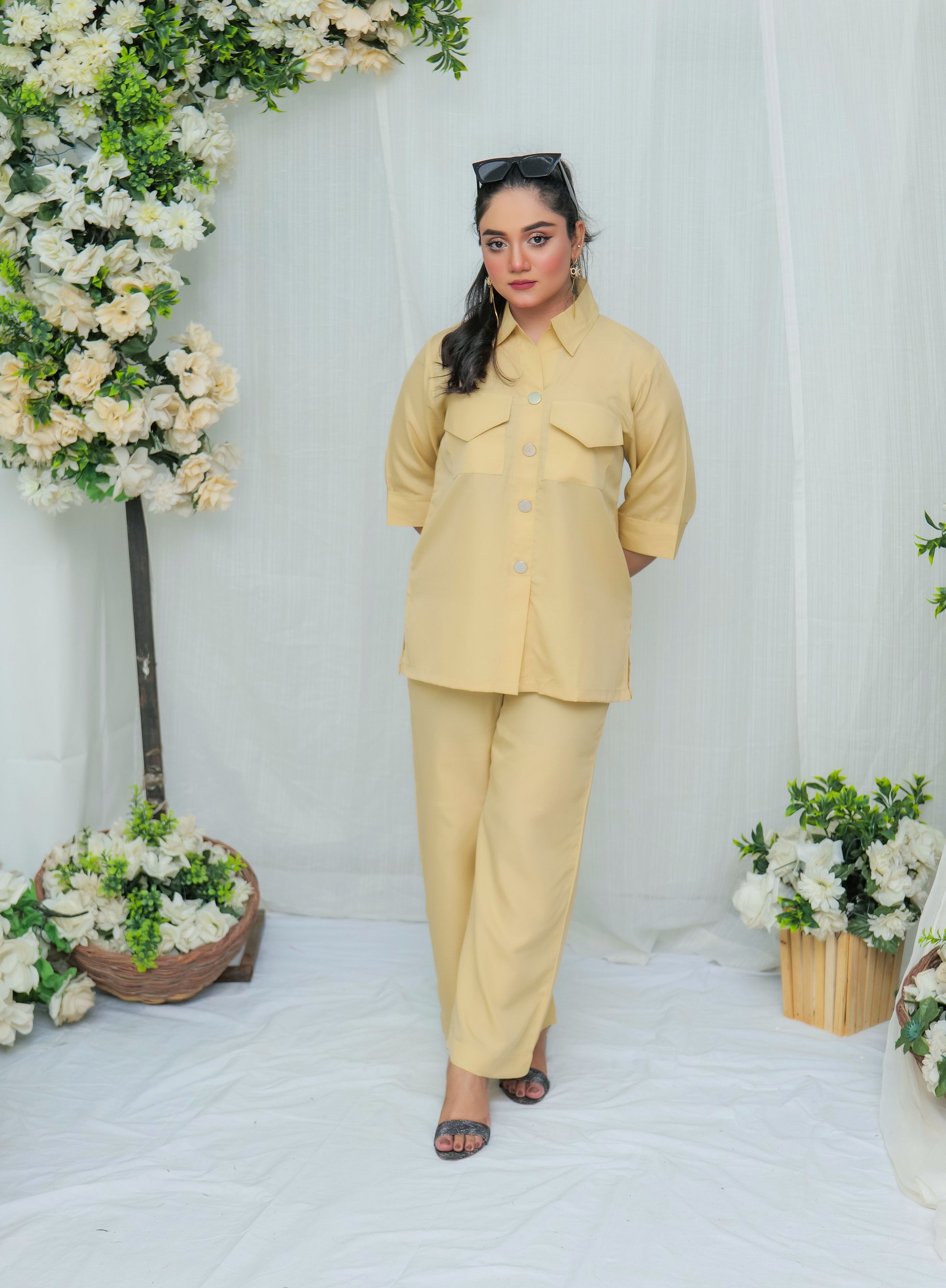 The shirt features a collared neckline, stylish flap pockets, and matte finish buttons that lend a sharp, polished edge. Paired with relaxed-fit straight trousers, Sandora offers the perfect fusion of Western-inspired tailoring and the relaxed comfort of Eastern silhouettes.