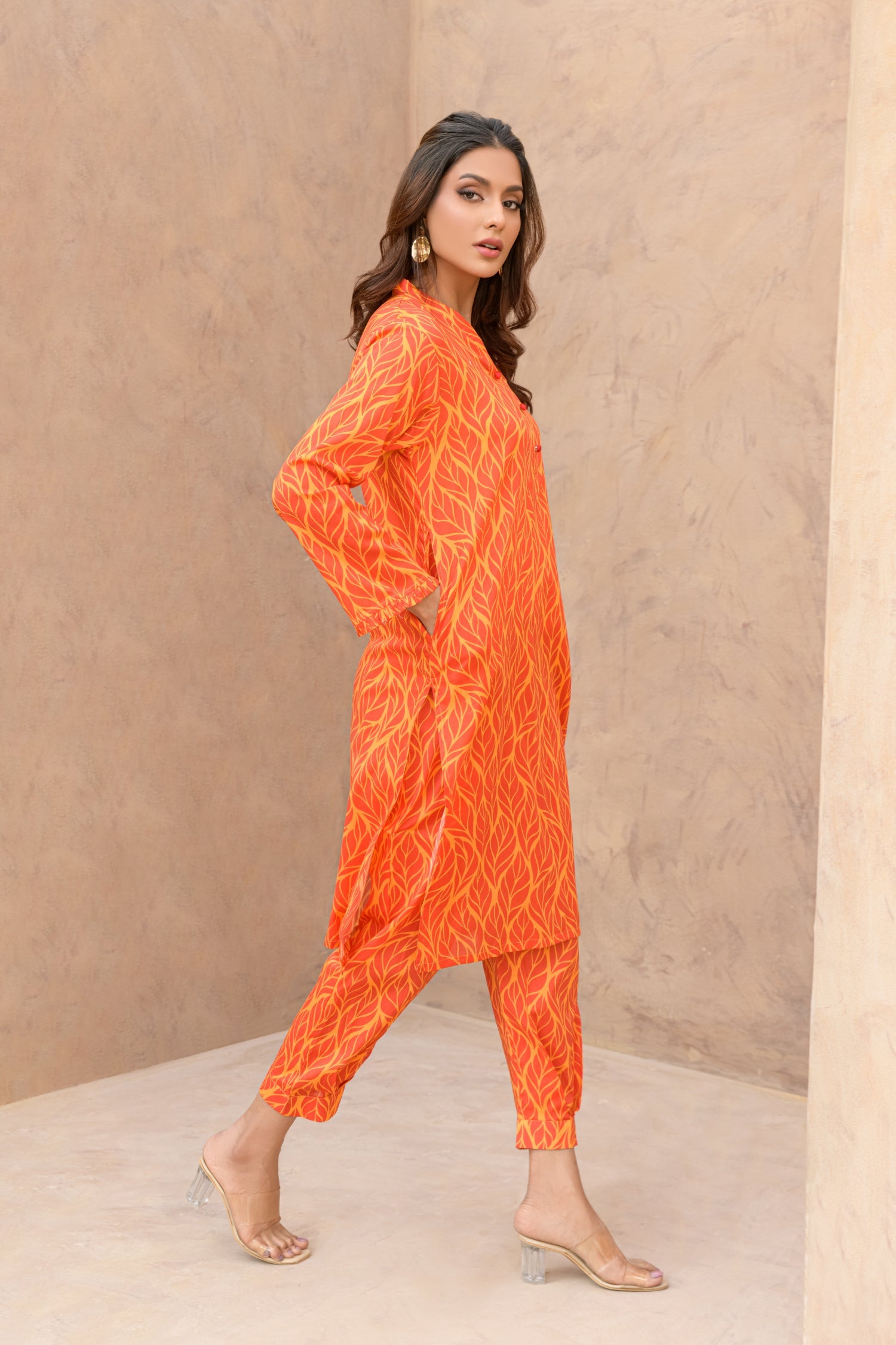 Elevate your style with this dress adorned in a captivating red and orange leaf pattern, paired with a trendy trouser, it effortlessly combines vibrant elegance.