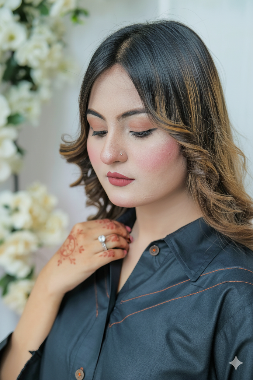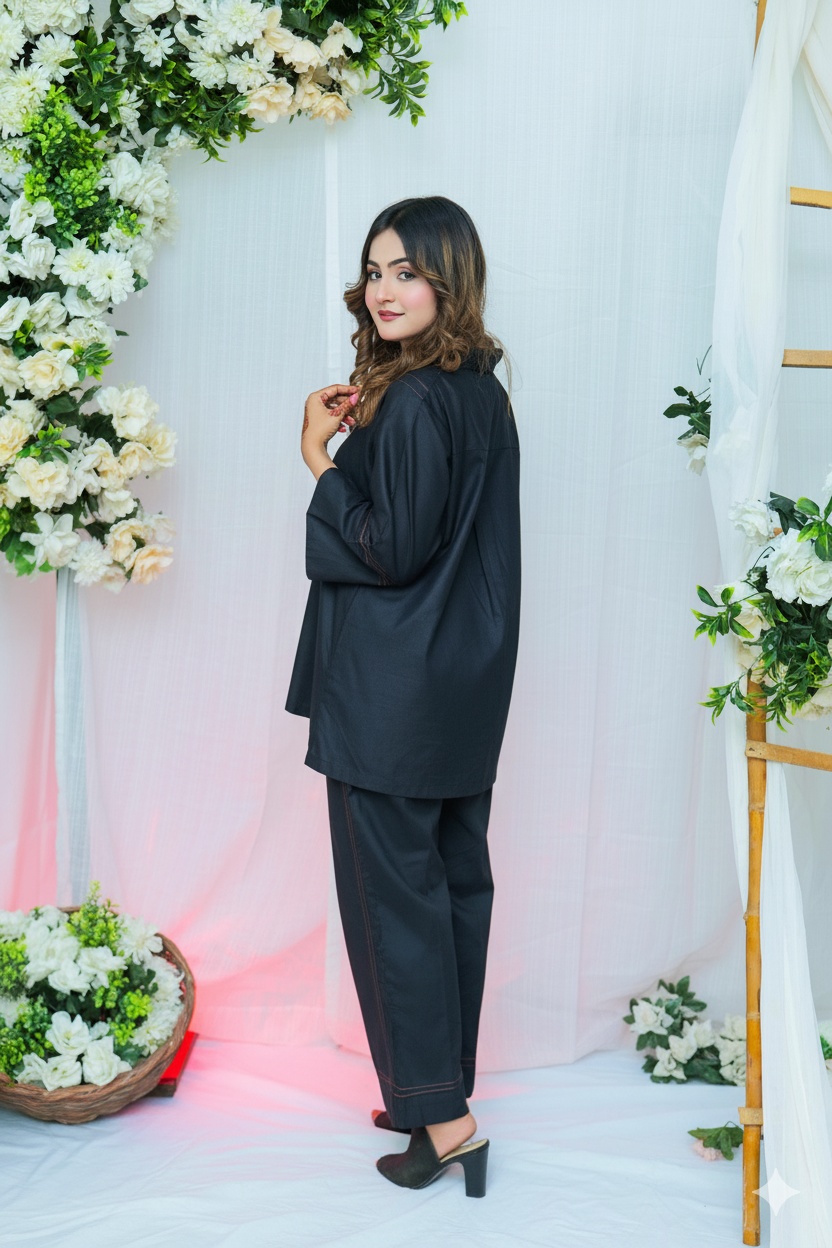 Crafted in jet black with subtle brown contrast stitching on the neckline, sleeves, and trouser hem, every detail is a nod to understated sophistication. The loose-fit button-down kurti offers breathable wear without compromising on shape, while the expertly tailored trousers ensure a smooth, flattering silhouette all day long.