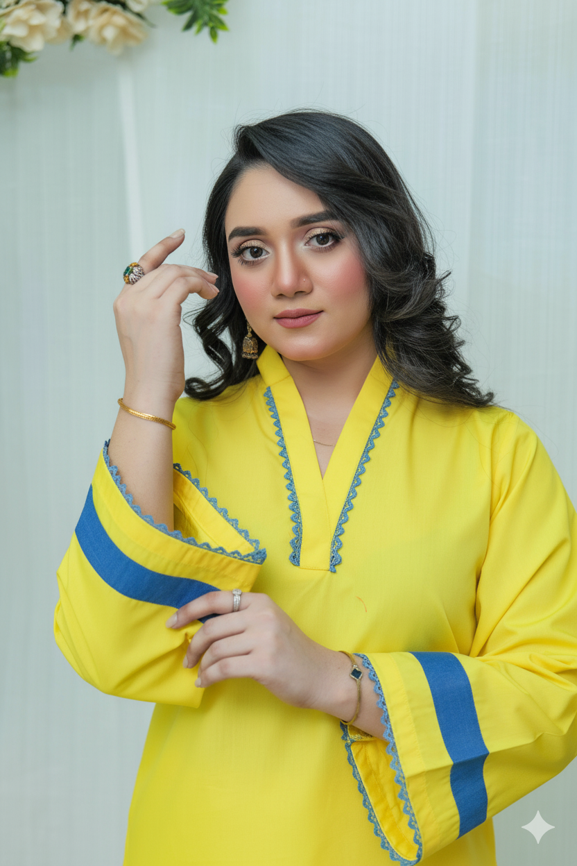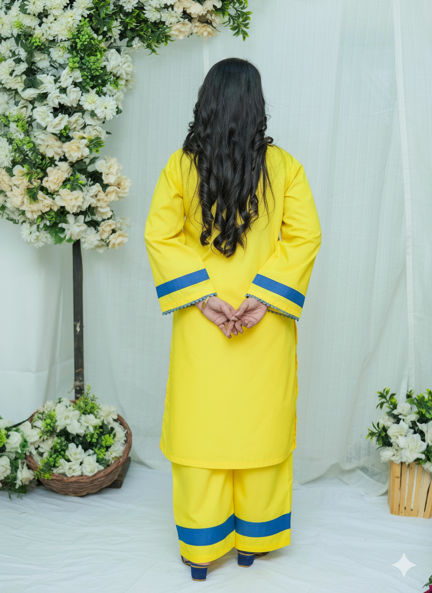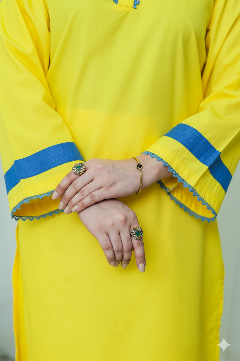 Radiant, cheerful, and beautifully balanced — the Sunveil 2-Piece Set brings sunshine to your wardrobe with bold color play and crisp tailoring. Crafted in a bright yellow hue and accented with striking blue details, this modern Eastern outfit makes everyday dressing feel vibrant and fresh.